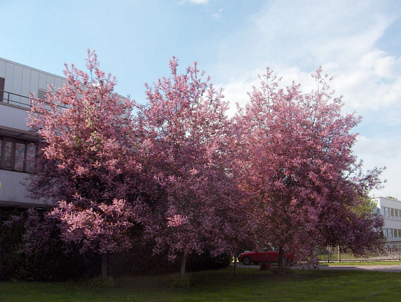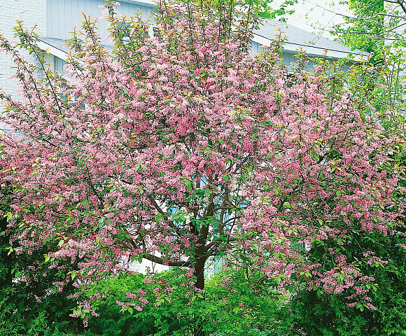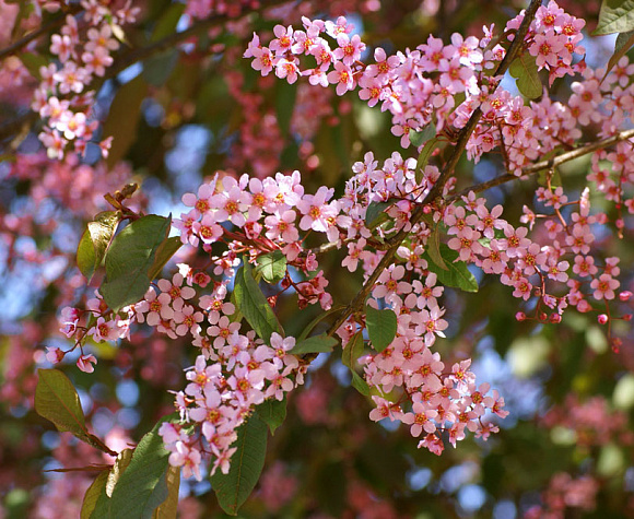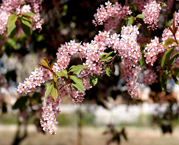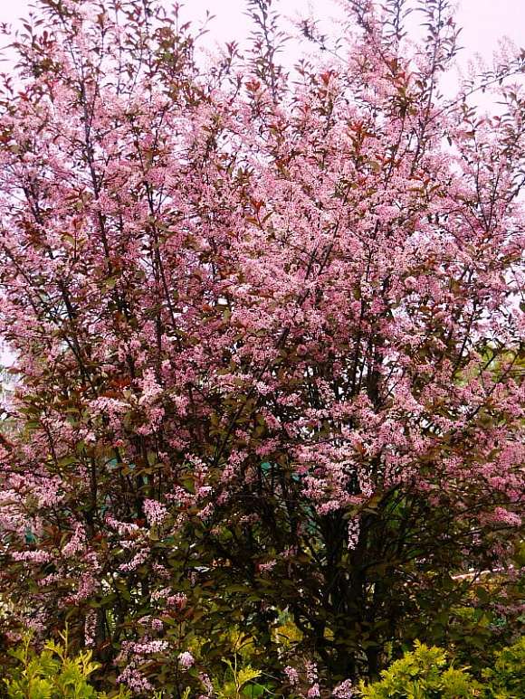 Бледно-розовые цветы, собранные в пышные кисти, накрывают кусты розовым облачком с легким ароматом миндаля. Молодые листочки пурпурные, летом зеленеют, но жилки остаются темно-бордовыми. Осенью пурпур вновь покрывает всю поверхность, а иногда листва становится оранжевой или розовой. Растет в виде куста или дерева с рыхлой кроной. Предпочитает влажные почвы, в тени плохо цветет и теряет пурпурную окраску.