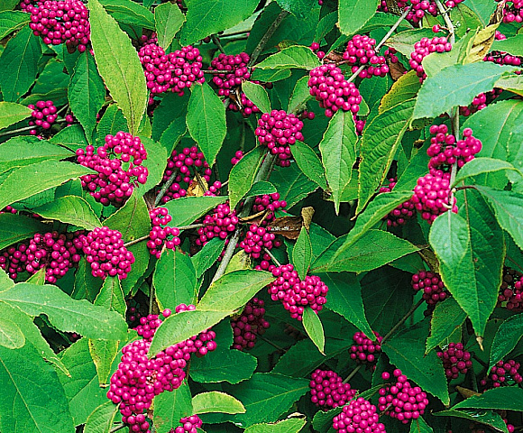 пурпурно-фиолетовые ягоды, похожие на ёлочные игрушки, которые остаются на ветвях почти всю зиму. Не