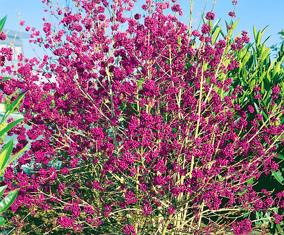 менее декоративны кусты и во время цветения в августе, когда полностью покрываются мелкими лилово-сиреневыми цветками, собранными