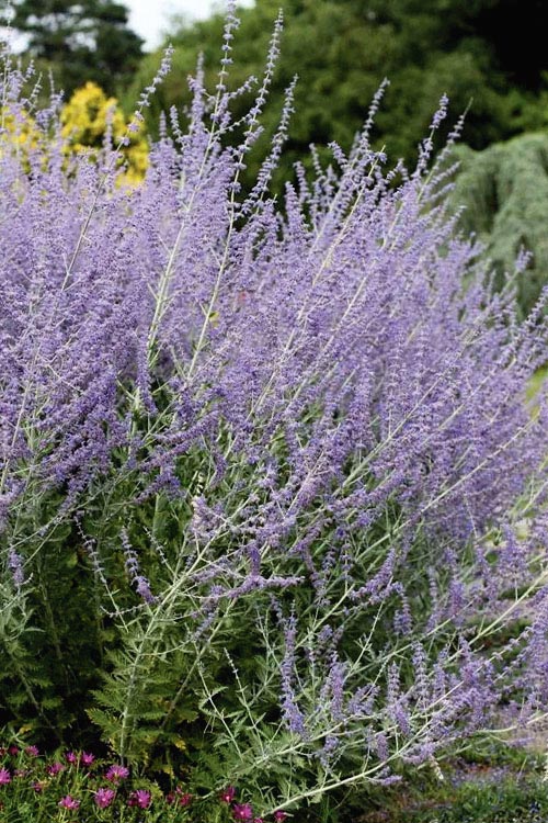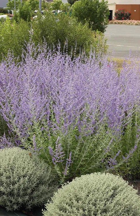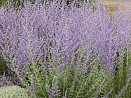 Малоуходный нежно цветущий кустарник. Цветение настолько легкое и воздушное, что создает эффект парящего голубого или сиреневатого облака. Разрастается вширь всего на 40 см. Великолепно смотрится в бордюрах с возвышающимися вертикалями соцветий. Листья очень ароматные, с характерным запахом шалфея при растирании.
