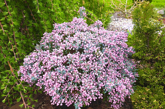 Небольшое, но изысканно-красивое растение. Отличается серебристо-голубым отливом листьев, которые похожи на листья розмарина. Его шаровидные нежно-розовые цветки, словно крохотные кувшинчики свисают на длинных цветоножках. Предпочитает торфяные почвы с достаточным количеством влаги. Абсолютно зимостойкое растение. Будьте осторожны при работе с ним, может вызывать ожоги, но своим внешним видом доставляет истинное удовольствие.