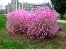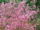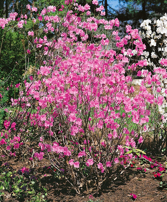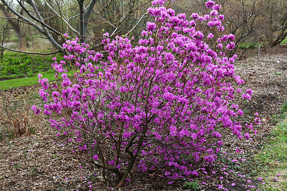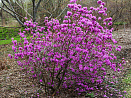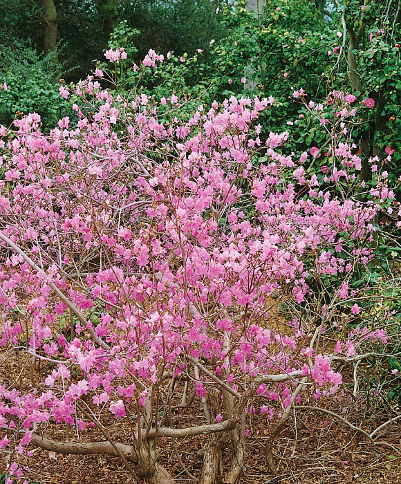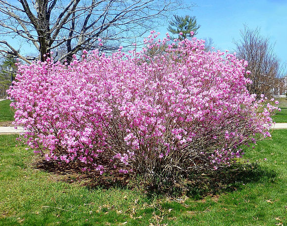 Один из самых ярких и изящных видов кустарниковых рододендронов. Его живописно окрашенные ветви сначала сиренево-вишневые, а затем становятся голубовато-сероватыми. До появления листьев сплошь покрываются крупными (до 5 см в диаметре) пурпурно-розовыми цветками, похожими на огромные колокольчики. Зеленые листья осенью приобретают золотисто-пурпурную окраску и не опадают вплоть до наступления устойчивых холодов, ярким пятном оживляя засыпающий сад. Здорово смотрится в сочетании с хвойными культурами. Обладает повышенной морозостойкостью (до -42 °С). Редко поражается вредителями и болезнями. Поддается формировке.