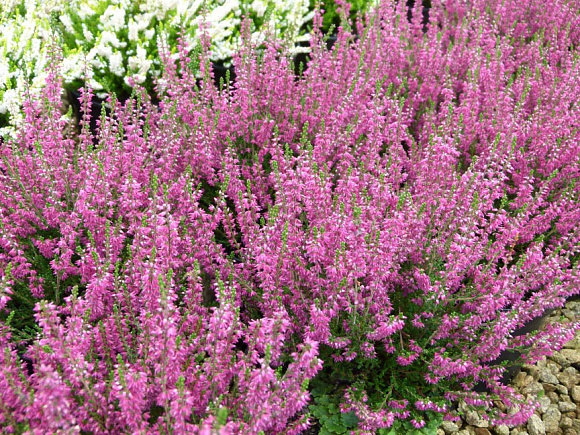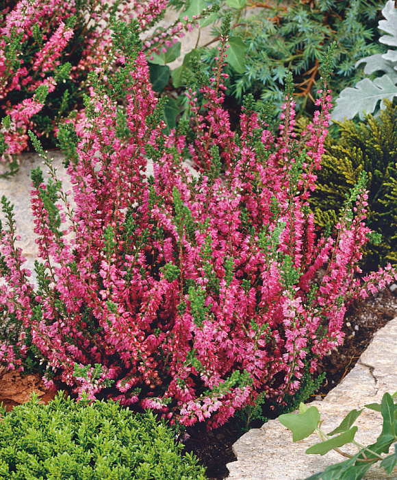 Густой быстрорастущий вечнозеленый стелющийся кустарник. Источает дивный медовый аромат. Во второй половине лета, когда многие цветочные растения уже ослабевают в своей красоте, вереск только начинает преображаться. Его изумительные блестящие карминно-красные цветки рассыпаны по невысоким раскидистым, устремленным вверх зеленым веточкам. C наступлением первых заморозков в образ добавляются бордовые и желтые оттенки. Не случайно растение подарило свое имя первому осеннему месяцу, который у славянских народов называется «Вересень». Для высадки вереска лучше выбирать открытые, хорошо освещенные участки. Отличается высокой устойчивостью к болезням.