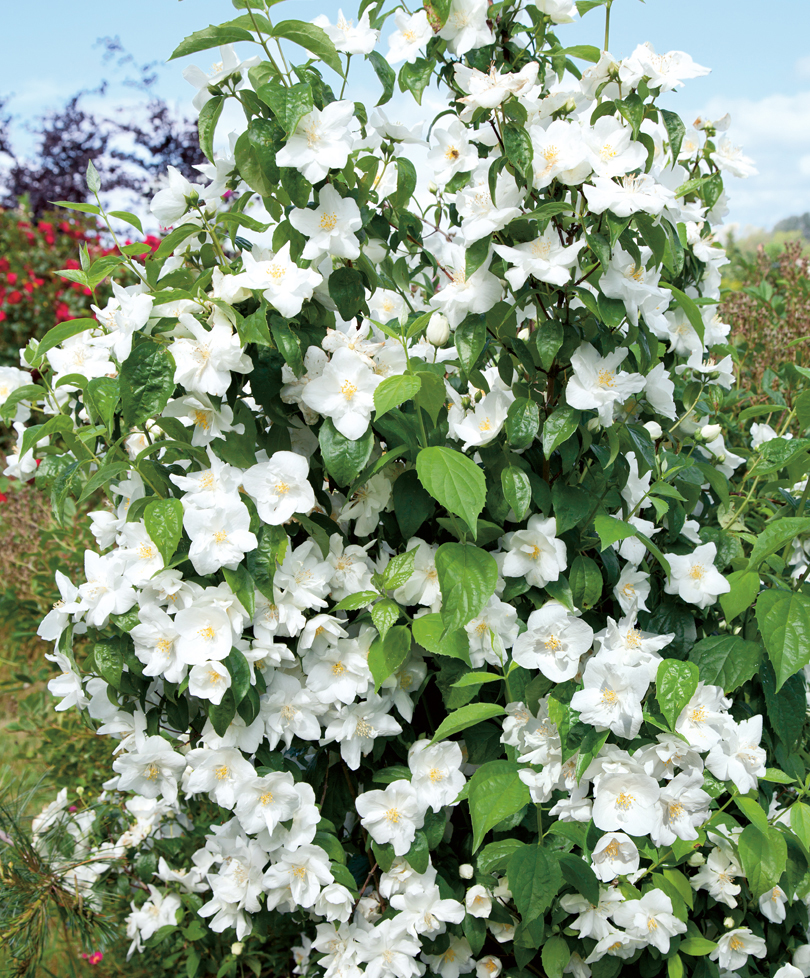 Декоративный статный кустарник с крепкими прямыми побегами. Цветение продолжительное, около месяца. Воздушные и пышные белые лепестки покрывают все ветви и источают сладкий дурманящий аромат, напоминающий ананас. Цветки крупные, полумахровые, расположены группами по 7-9 шт. Листва продолговатая, крупная, с зазубринами по краям, обладает насыщенным зеленым окрасом. Несомненным достоинством сорта является засухоустойчивость. Растение светолюбиво, но может расти в полутени.