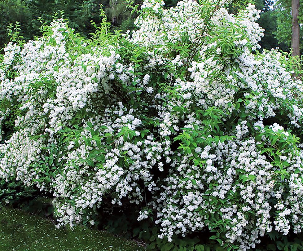 Усыпан пушистыми снежными хлопьями искрящихся белизной махровых цветков 2-2,5 см в диаметре, с приятным ананасно-земляничным ароматом.
