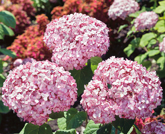 Пышные шаровидные розовые соцветия на сильных ветвях, крупные овальные листья эффектного зеленого цвета с бронзовым оттенком делают этот сорт изумительно красивым. Отличается очень обильным и продолжительном цветением, уже начиная с года посадки. Куст компактный, шириной до 90 см, растет быстро, не разваливается во время цветения. Крона округлая. Соцветия крупные (35 см в диаметре) плотные. Может подмерзать, но быстро восстанавливается. Сорт универсален, великолепен в качестве солитера и в групповых посадках. Из него получаются роскошные изгороди. Предпочитает влажную подкисленную почву. Зимостойкость до -25°С.
