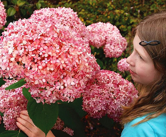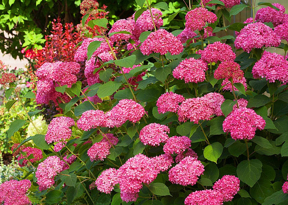 Гортензия древовидная (Hydrangea arborescens) – округлой формы кустарник с ярко-зелеными листьями и крупными (до 15 см в диаметре) шапками соцветий. Можно без преувеличения сказать, что это самый морозоустойчивый вид гортензий! Цветет очень обильно. К составу грунта непривередлива. Полив минимум один раз в неделю (взрослому растению не менее 15 литров).