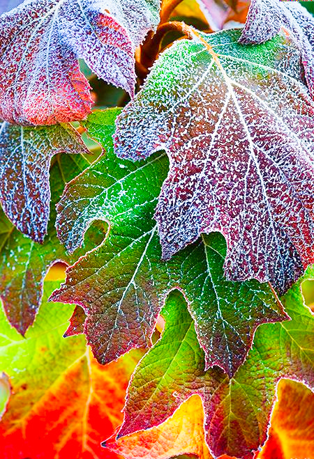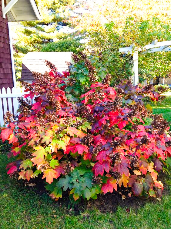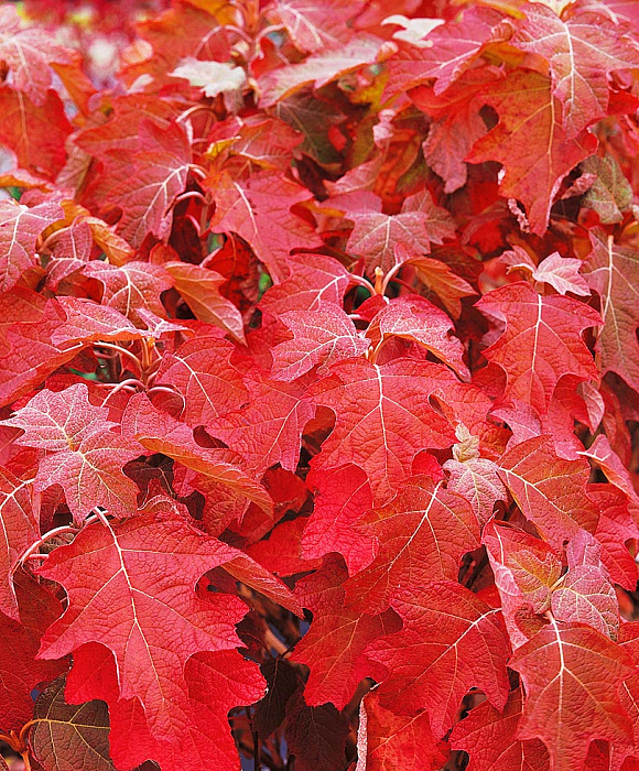 Практически весь сезон листья дуболистной гортензии имеют зеленую окраску, а осенью эффектно переходят в темно-красный и бордовый цвет.