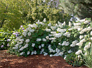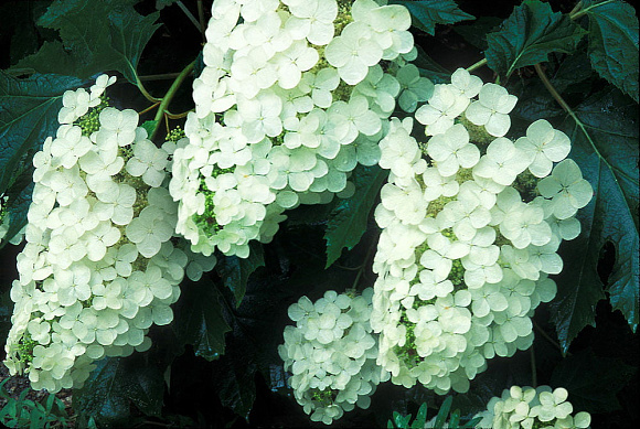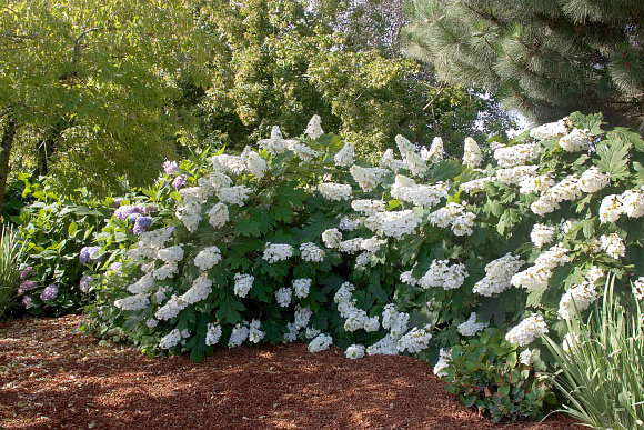 Гортензия дуболистная (Hydrangea quercifolia) — интересный и эффектный листопадный кустарник. Привлечет внимание в любом случае: как во время цветения, так и после него. Изюминка этой разновидности гортензий кроется в ее огромных (до 25 см!) приятных на ощупь листьях, по форме напоминающих дубовые. Соцветия крупные конусовидные с большими (до 3 см) белыми цветками. Очень быстро растет и ветвится. Им смело можно украсить любой затененный участок. Не выносит известковый грунт. Корневая система поверхностная. Цветет до глубокой осени и сохраняет яркие краски до заморозков. Зимостойкость до -30 °С.