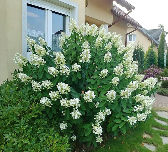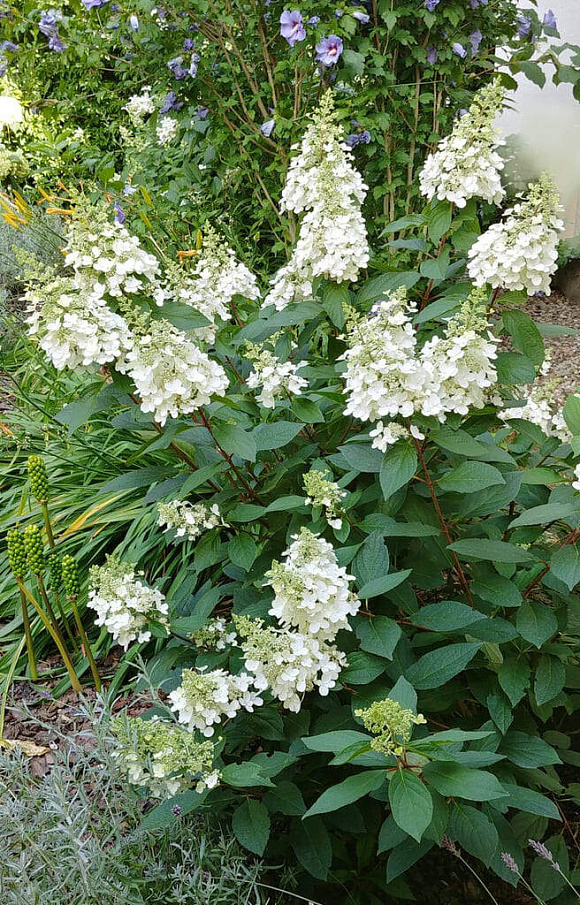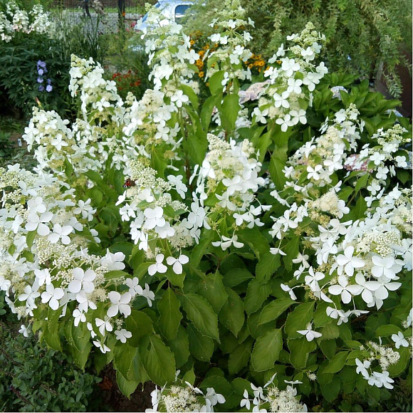 Одна характерная особенность Леваны – сладкий приятный аромат. Этот сорт очень высокорослый и быстрорастущий, достигает высоты 3 м всего за один вегетационный период. Побеги прямостоячие, очень жесткие, прочные, поэтому растение не разваливается во время цветения даже в дождливую погоду и не требует подвязки. Форма куста слегка расклешенная. Побеги светло-коричневые, черешки листка приглушенно красные. Листья заостренные, достаточно светлые, изумрудно-зеленые и крупные по размеру; часто края листа приподняты вверх и имеют форму лодочки, на них множество выраженных зазубрин. Соцветия огромные (достигают 50 см!), метельчатой узкопирамидальной формы. Стерильные цветки крупные, имеют 4 или 5 чашелистиков очень необычной формы, размером до 9 см; когда они раскрываются полностью, ввиду своего размера перекрывают фертильные цветки. Окрас лепестков ослепительно-белый и сохраняется до конца цветения. Растение очень технологично, не требует подвязки. Может довольствоваться бедной почвой и мириться с кратковременным застоем влаги. Прекрасно смотрится как солитер или в составе живых изгородей. Для получения выровненных соцветий боковое ветвление нужно убирать при весенней санитарной обрезке.