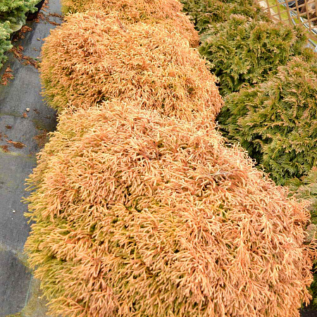 Шаровидная туя – «золотой холмик» с теплым медовым оттенком кроны. Хвоя ажурная, чешуйки не плотно прижаты к побегам, из-за чего куст кажется более пушистым. Очень медленнорастущая. После 10 лет вегетации достигает всего 60 см в высоту и менее метра в ширину. Слишком сухое и тенистое место становится причиной потери декоративности.