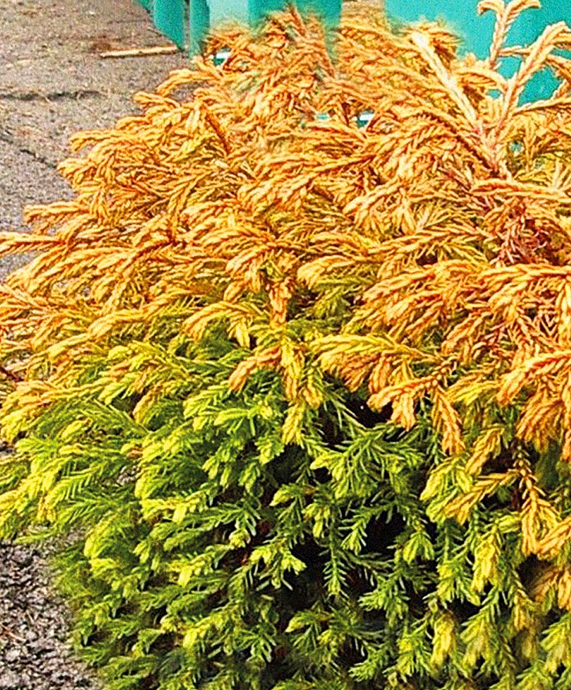 Забавная медленнорастущая жёлтая подушка. Мягкая неколючая хвоя внутри куста светло-зелёная, снаружи жёлто-зелёная с оттенком красноватого. Зимой окраска становится оранжево-коричневой. Отлично переносит все виды обрезки. В снежные зимы куст может ломаться от нагрузки снегом, поэтому его обвязывают. Сажают на солнце в любые цветочные композиции, вдоль дорожек или как солитер.