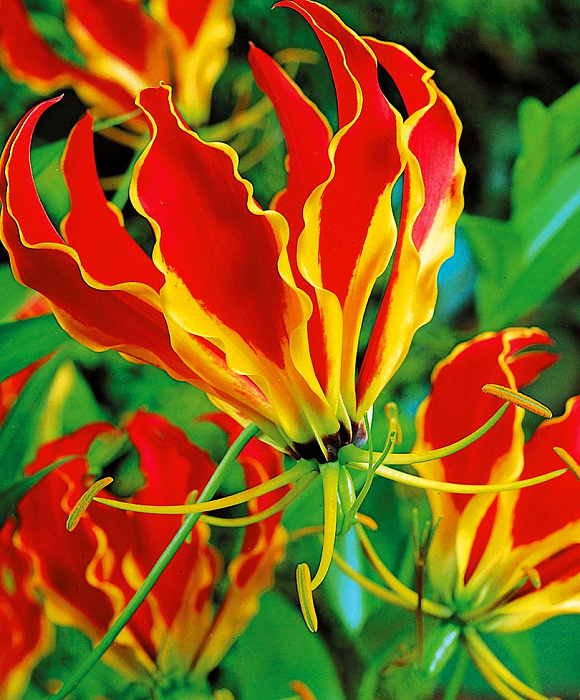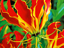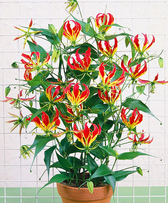 Трудно устоять перед восхитительной красотой этого замечательного «цветка славы», напоминающего унесённое сильным ветром огненное пламя костра. Это комнатное вьющееся растение — лиана высотой до 2 м. Листья ланцетовидные, цветки большие (до 10 см длиной и до 12 см в диаметре!), одиночные, на длинных цветоножках. В период цветения жёлтая кайма постепенно исчезает, красный цвет становится всё более насыщенным, а тычинки с волнующимися от малейшего движения воздуха пыльниками радиально распрямляются. Цветущая лиана создаёт впечатление зелёной гирлянды, пляшущей яркими огнями африканского ритмичного танца с факелами. Зрелище сказочное и совершенно неповторимое.