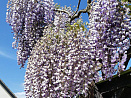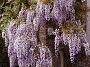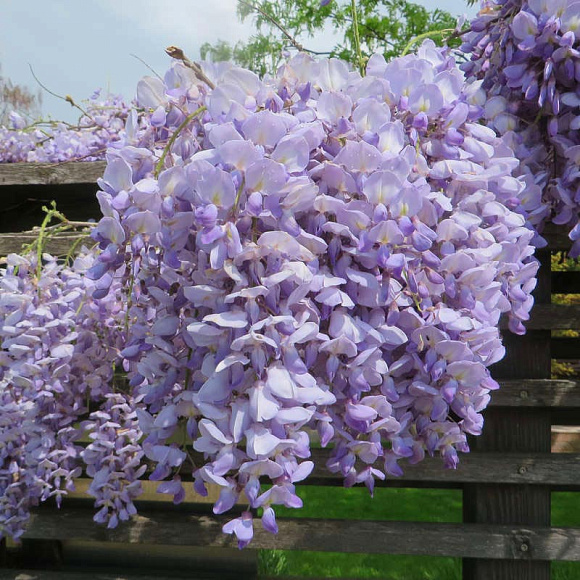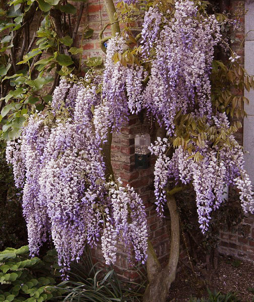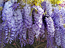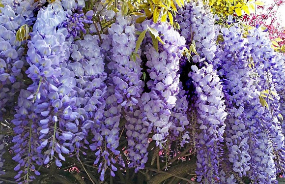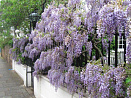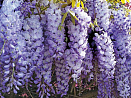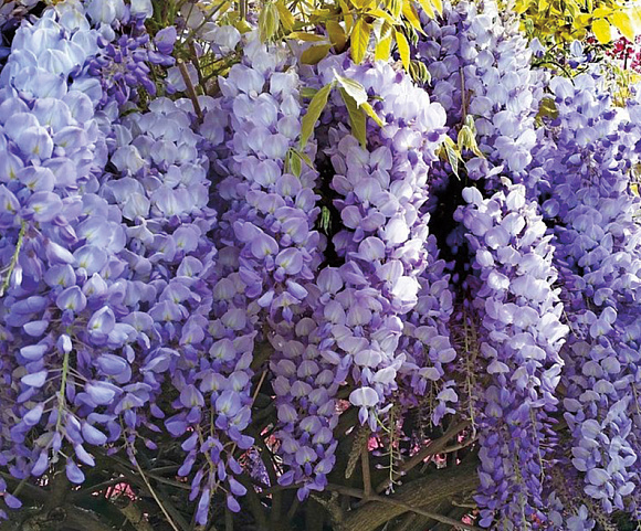 Красивая вьющаяся лиана образует причудливые сине-фиолетовые каскады, напоминающие тропический водопад. Эффектные воздушные кисти со множеством цветков замысловатой формы достигают в длину 30 см. Весеннее цветение обильное и продолжительное, может повторно распуститься в августе. Глициния — отличное решение для оформления беседок и навесов, она не только укрывает от солнца, но и источает прекрасный аромат. Дополнительную декоративность лиане придает золотисто-желтая листва осенью, также она плодоносит бобами длиной до 15 см. Лучше всего растет на хорошо освещенных участках с дренированной, плодородной почвой.