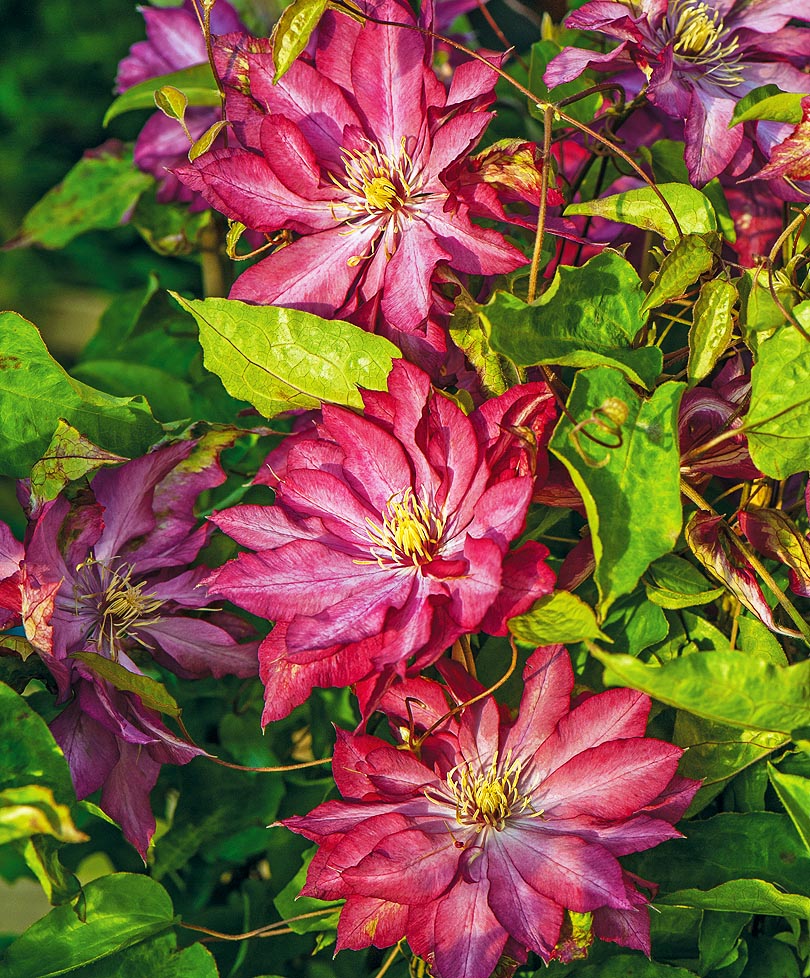 Невероятной красоты и размеров японский сорт со светло-красными махровыми и полумахровыми цветками до 14 см в диаметре. Цветет дважды за сезон, хотя и менее обильно во второй раз. За опоры цепляется листовыми черешками. Любит солнечные места. Пригоден для выращивания в контейнерах.