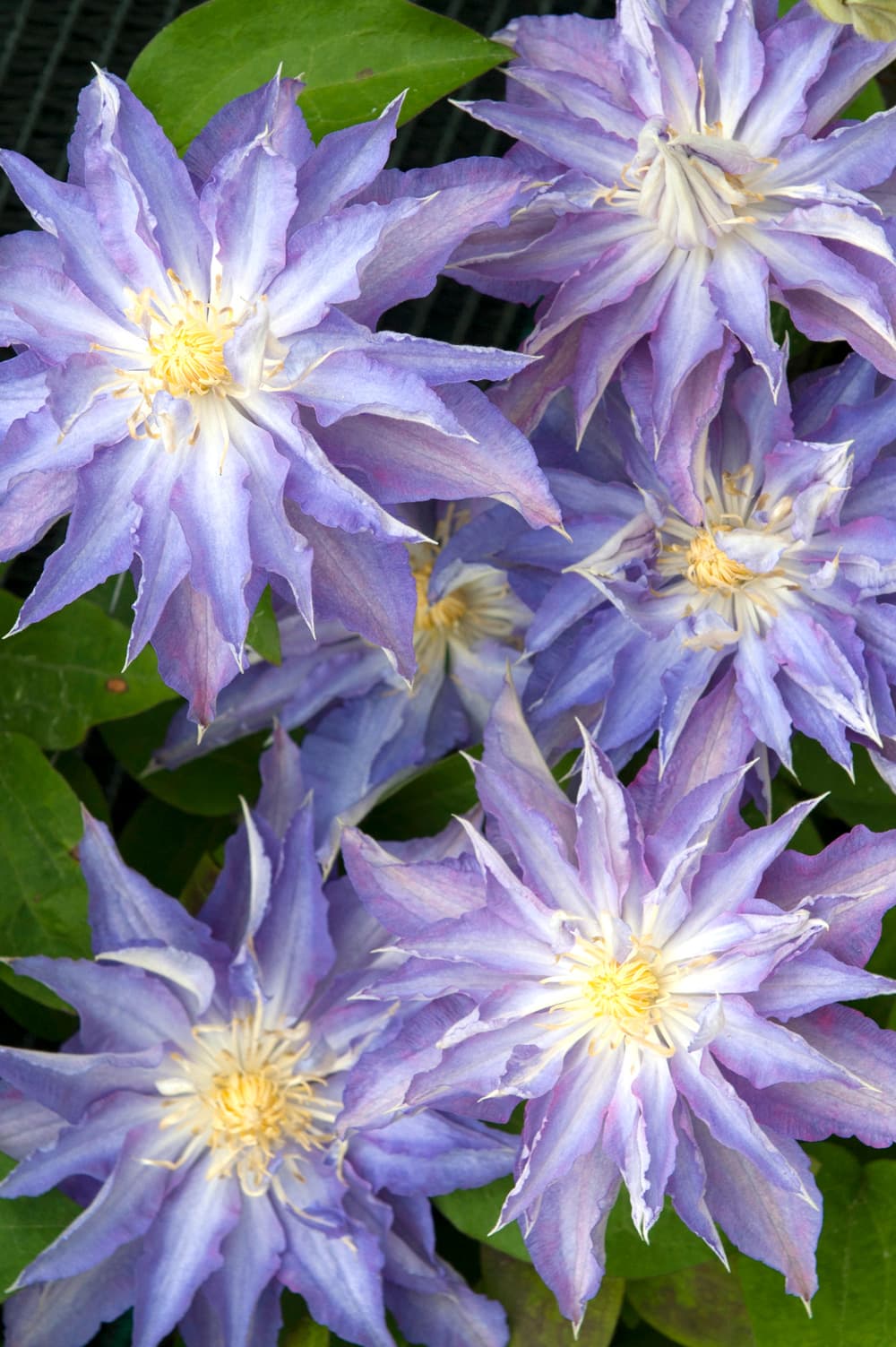 Почувствуйте себя звездочетом с крупноцветковым ранним клематисом Тайрислунд. Потрясающие сиренево-голубые цветки-звезды с волнистыми краями и заостренными кончиками (13-16 см в диаметре) с более светлыми продольными полосками посередине лепестков и контрастные желтые пыльники на кремовых тычиночных нитях. К условиям освещения и выращивания нетребователен. Прекрасно подходит для больших контейнеров.