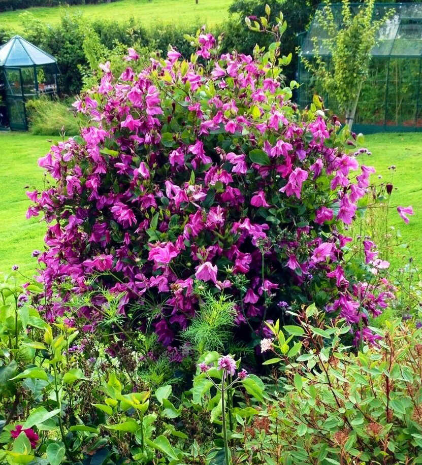 Неожиданный привет из советского времени. Растение лиановидное, полуплетистое. Побеги не очень цепкие, поэтому нуждаются в подвязке. А если дать кустарнику свободу, то получится прекрасный декоративный почвопокровник. Цветки необычные, колокольчатые, пониклые, нежных розово-лиловых оттенков. Зимостойкость -34 °C.