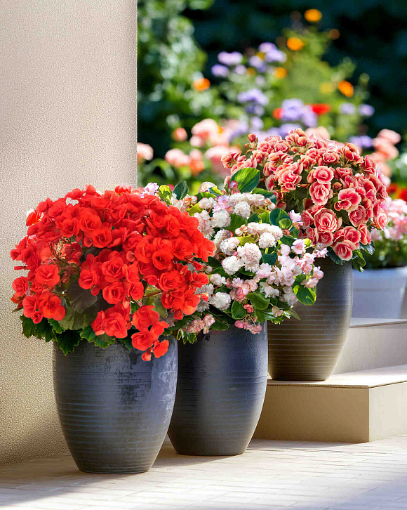 Буйное цветение и неповторимые выразительные краски. Махровые или очень махровые цветки сортов набора располагаются группами на многоярусных цветоносах. Благодаря неприхотливости в уходе и компактному размеру, часто используются в декорировании не только садовых участков, балконов и террас, но и офисных помещений и кафе. Цветение обильное, продолжительное, до заморозков. Если вы занесете горшки домой, то бегонии будут цвести и дальше в домашних условиях.