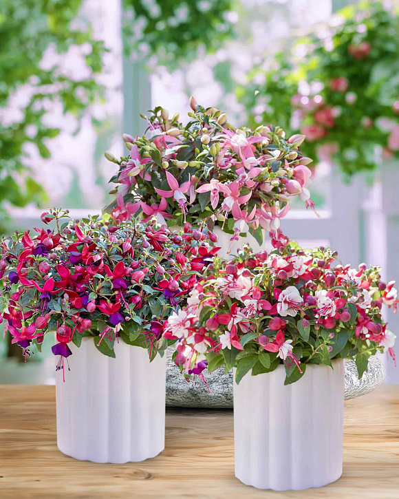 Нежный и вкусный набор из новейших гибридных кустовых фуксий. Начинает цвести на две недели раньше, чем другие фуксии, и крупные цветы не спрятаны внутри растения, а расположены над листьями и нахально демонстрируют свою красоту. Фуксии любят воду. Если день выдался очень жарким, следите за тем, чтобы почва была влажная. При первых похолоданиях ниже +10 °С растение необходимо занести в помещение. Чтобы подготовить его к зимовке, рекомендуем постепенно сократить полив, прекратить внесение удобрений и переместить вазон с растением в прохладное помещение с температурой воздуха 10−15 °C. Если вы планируете оставить фуксию на зимовку в погребе или в гараже, можно утеплить вазон пенопластом или поставить его в ящик с опилками. К свету фуксия в этот период безразлична. Но если же оставить ее в хорошо отапливаемом помещении, то по весне буйного цветения ждать не придется. Также перед зимовкой рекомендуем обрезать растение и истребить вредителей.