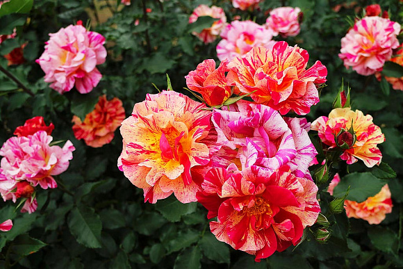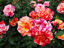 Ни на кого не похожая роза, каждый цветок которой индивидуален и неповторим. Бутоны необыкновенного золотисто-коричневого цвета. Двуцветные лепестки с полосками и штрихами окрашены во все варианты оттенков красного, желтого и белого. Легкий ненавязчивый фруктовый аромат сопровождает феерически пышное и продолжительное цветение. Цветы не боятся дождя и не выгорают на солнце. Кусты довольно раскидистые.