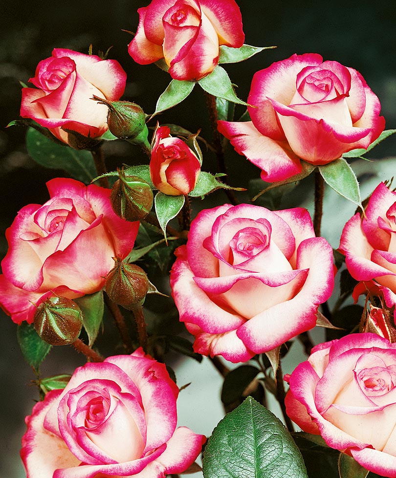 Сорт с цветками потрясающей красоты: лепестки у основания окрашены в нежный кремовый цвет, который к краям постепенно переходит в малиново-розовые тона. Бутоны имеют насыщенный малиновый цвет. Цветки распускаются медленно, словно давая возможность полюбоваться их совершенством. Размер цветка 7-8 см. Растение невысокое, кустистое, с тёмно-зелёной глянцевой листвой. Слабая устойчивость к дождю и грибковым болезням. Эта роза была выведена в качестве срезочной, поэтому цветки долго стоят в букетах. Сорт подходит для создания живой изгороди.