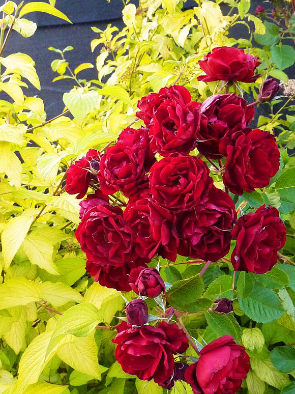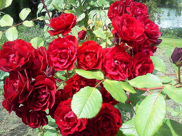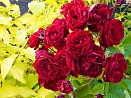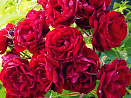 Мечта садовода: сохраняет красоту и форму в любых условиях. Цветки до 8 см в диаметре, густомахровые, яркие, карминно-красные, с коралловыми и тёмно-вишнёвыми оттенками на атласном шёлке лепестков. Аромат свежий, приятный. Куст компактный, округлый.