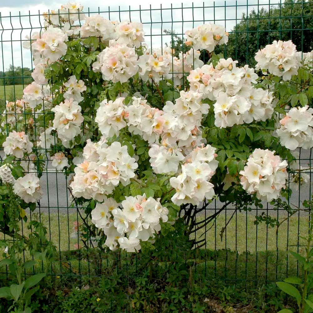 Она в списке лучших роз мира! Ее простота и нежность в купе со стойким характером покорили сердца садоводов. Персиковые бутончики раскрываются в трепетные кремово-белые цветки, диаметром 7–9 см. В каждом соцветии их может быть от 10 до 30 штук. Куст хорошо разветвленный, с сильными побегами, гармонично смотрится на участках с естественной природной средой. Зимостойкость −29 °С.