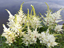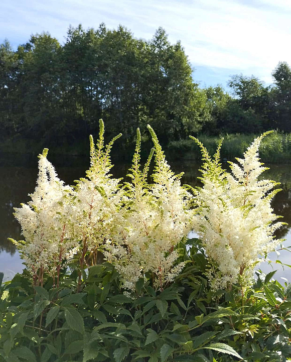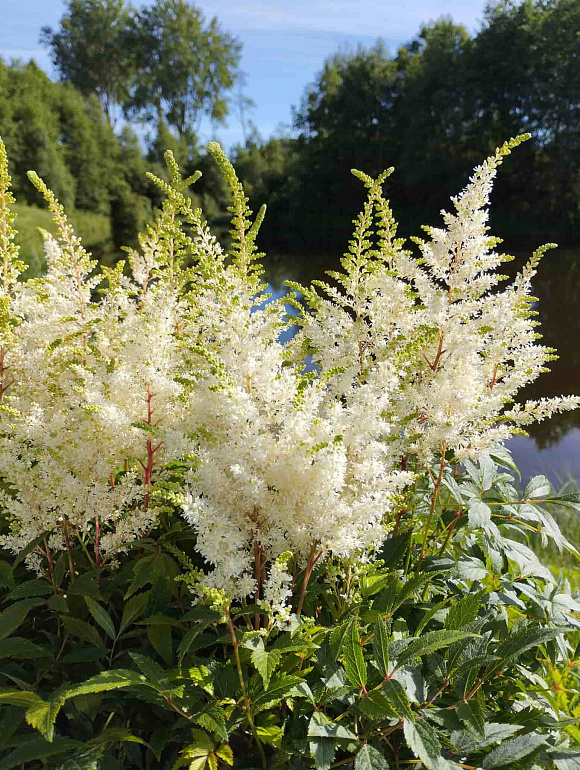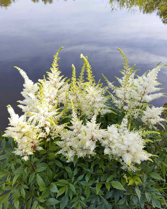Невесомые белоснежные кружевные соцветия на бордовых побегах привлекают восхищенное внимание садоводов эффектной внешностью и неприхотливостью. Эта астильба незаменима при оформлении цветников в тенистых и полутенистых участках сада. Прикорневая зелень яркая, сочная. Листья дваждыперистые, резные, служат прекрасным декоративным фоном. Групповые посадки возле вашего дома, террасы или зоны отдыха создадут днем праздничную торжественность, а вечером сделают ваш отдых комфортным, позволят расслабиться и избавиться от неприятных эмоций. Растения высокоустойчивы к атакам вредителей и большинству заболеваний. Любят регулярный полив под корень. Зимуют под снегом без дополнительного укрытия.