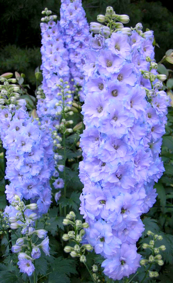 Великолепия гигантских "свечек" с ажурными лепестками белых, голубых, ярко-лавандовых и салатовых, кремовых и цвета фуксии. Цветки 6-8 см в диаметре. Цветоносы прочные, соцветия очень плотные. Листва светло-зеленая, сочная. Высокоустойчивы к болезням. Цветут обильно и продолжительно. Надежные и зимостойкие.