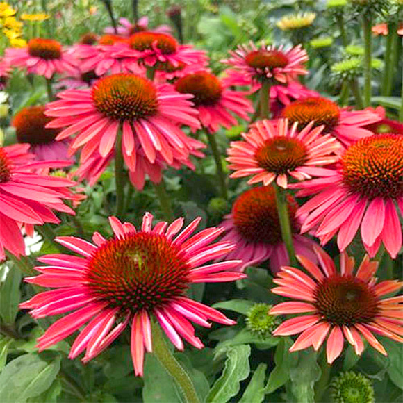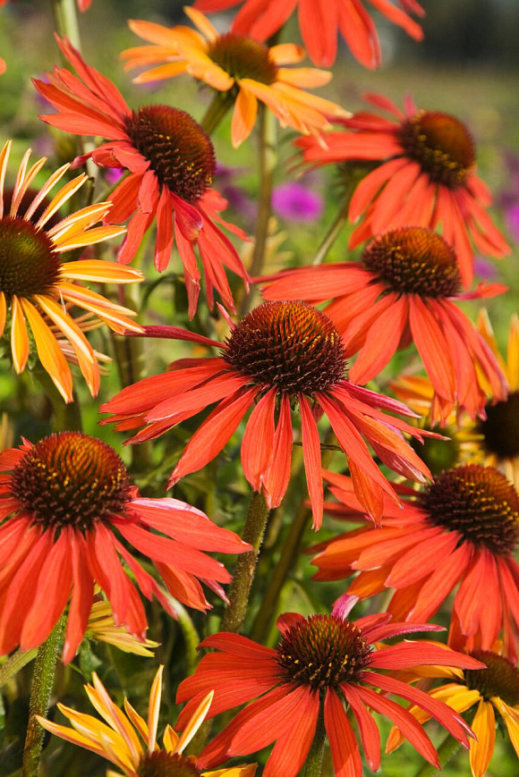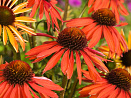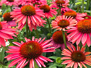 Жаркая летняя красавица. Завораживает в пору цветения. Плавно меняет за лето свою окраску с желто-оранжевой до красно-малиновой. Соцветия невероятно красивые, по форме похожи на ромашки, очень крупные, диаметром до 12 см, с выпуклой сердцевиной. Сорт самодостаточный, хорошо смотрится в одиночных и моно-посадках.