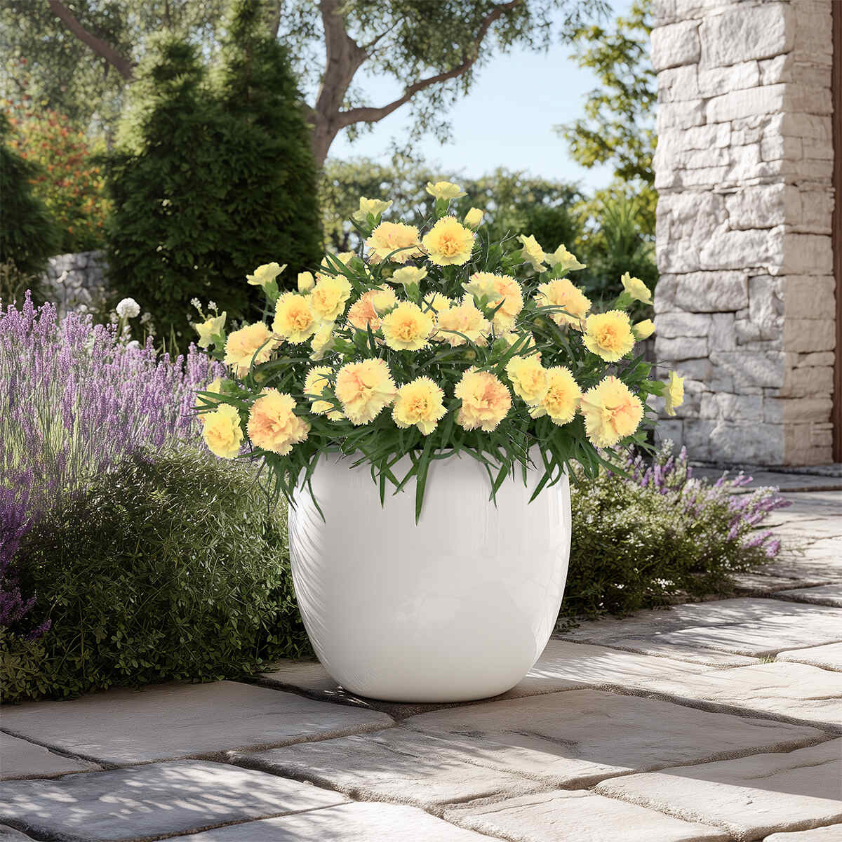 Новейшие широколистные сортосерии благоухающих компактных гвоздик. Отличаются исключительной однородностью и долговечностью. Образуют густые, хорошо разветвленные кустики, покрытые крупными махровыми душистыми цветками, диаметром 4–5 см, самых различных окрасок. Растения засухоустойчивые. Идеальное решение для контейнеров, балконных ящиков, подвесных вазонов и кашпо. Рекомендуем обильный полив раз в неделю. Отцветшие цветки прищипывать у основания. В суровом климате Урала и Сибири выращивается как однолетник.