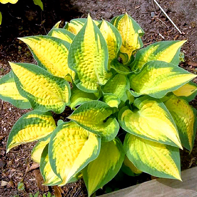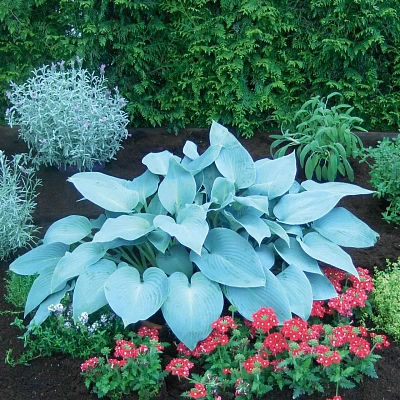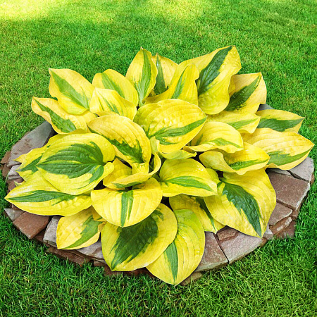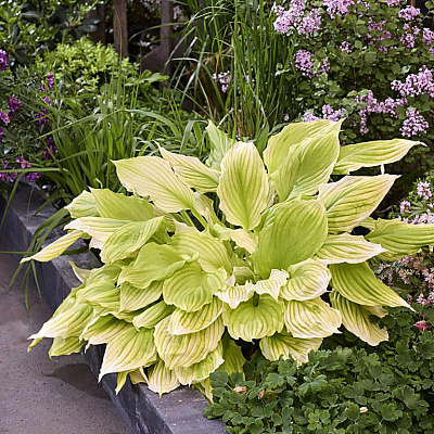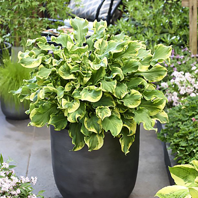 Удивительный светящийся окрас. Уверенные темно-зеленые мазки словно выполнены кистью художника. Листья плотные, толстые, не горят на солнце. У взрослых экземпляров сильно гофрированные. Цветет в июне нежно-лавандовыми цветками. Зимостойкость до -35°С.