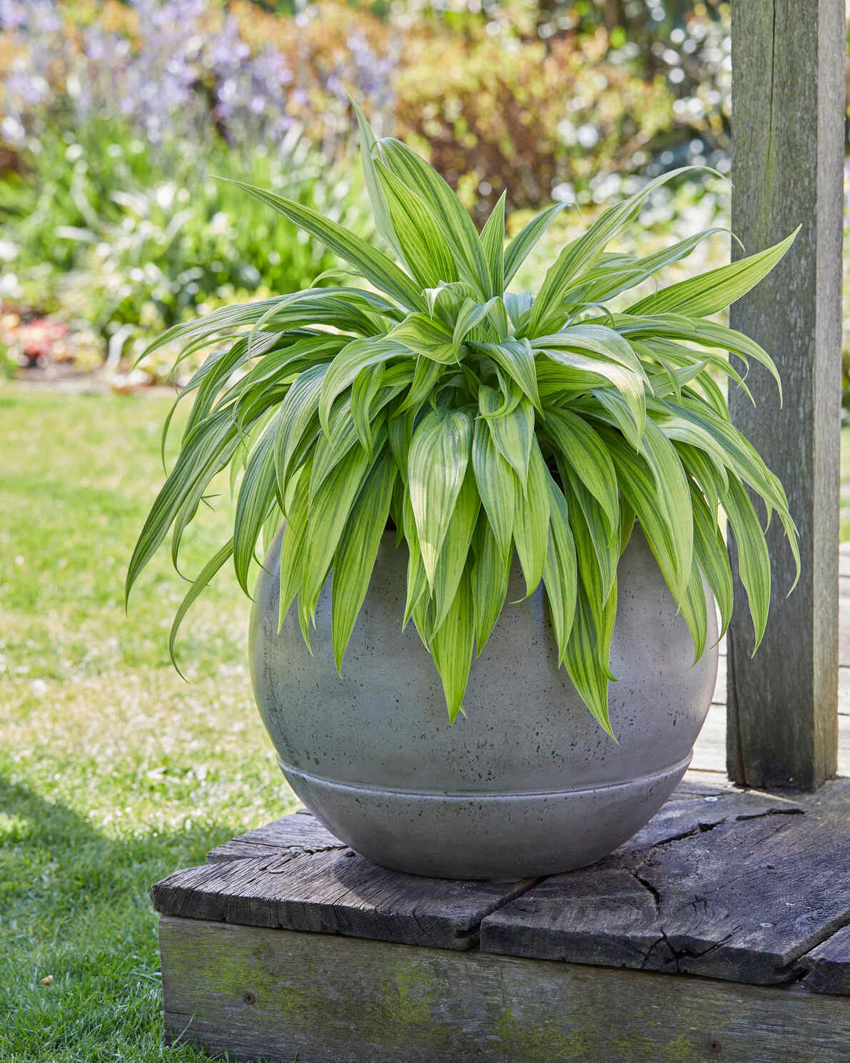 Компактный медленнорастущий декоративный островок. Листья ланцетные, узкие, заостренные, слегка волнообразные. Сине-зеленые с отчетливым жилкованием и хаотично прорисованными желтовато-оливковыми полосами. В полутени расцветка проявляется более ярко и контрастно. Цветки светло-лавандовые похожи на колокольчики, изящно склонившиеся к земле.