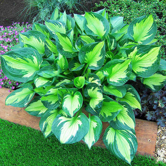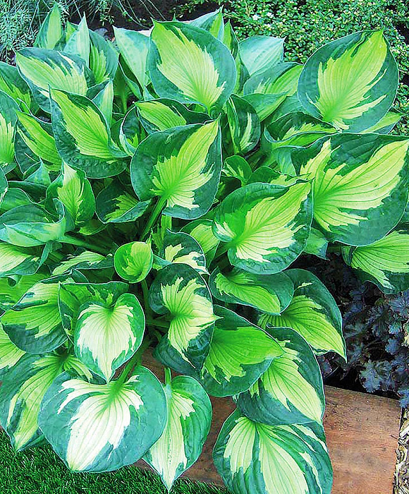 Великолепная хоста-вихрь со слегка закрученными и очень выразительными яркими пёстрыми листьями, изменяющими свою окраску в течение сезона. Светлая нежно-кремовая или зеленовато-молочная середина листа охвачена широкой тёмно-зелёной каймой, языками заходящей к центру. Декоративна не только в тени, но и в полутени, и на более освещённых участках.