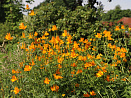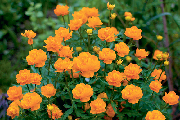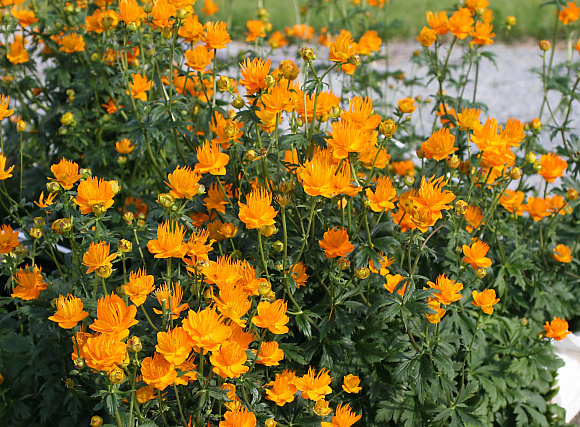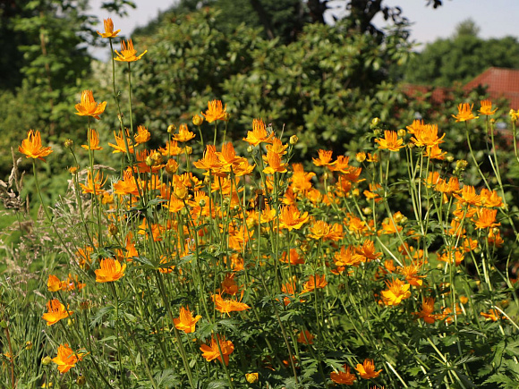 Яркие вспышки оранжевого огонька среди темной зелени — это купальница китайская. Соцветия имеют необычную форму: среди воздушных чашевидных лепестков вверх устремлены более тонкие, словно языки танцующего пламени. Травянистое растение довольно кустистое и высокое. Листва резная, с зубчатым краем. Многолетник неприхотливый, но не стоит допускать чрезмерного высыхания почвы. Обладает хорошей стойкостью к вредителям и сильным иммунитетом.