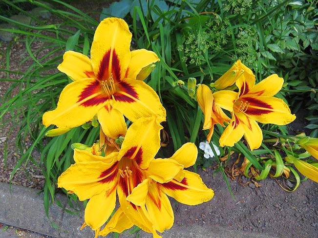 большие, золотисто-жёлтые, с тёмно-красным глазком и светящимся лучистым центром. Среднего срока цветения.