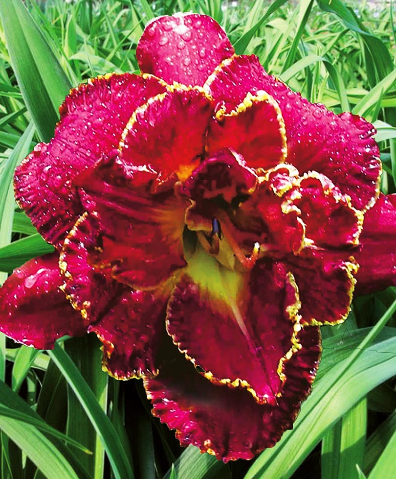 Потрясающе красивый махровый цветок, энергетически сильный, властный, подчиняющий себе пространство и время. Лепестки рифлёные, с выраженной текстурой, насыщенных пурпурно-вишнёвых оттенков, усиленных контрастной тонкой золотой гофрированной кромкой и светлым лёгким зеленовато-оливковым горлом.