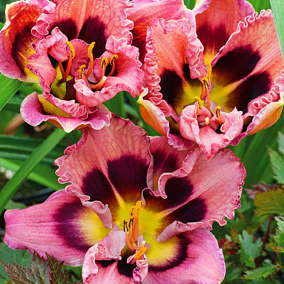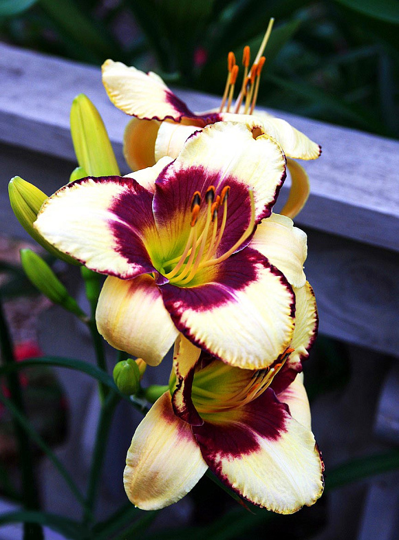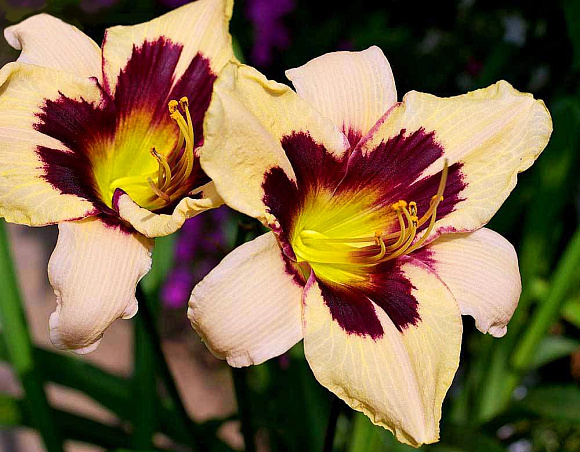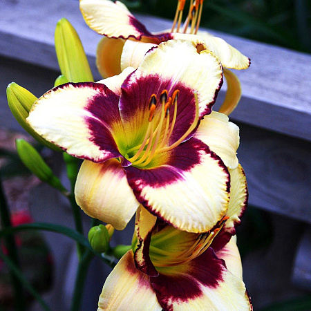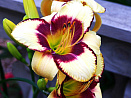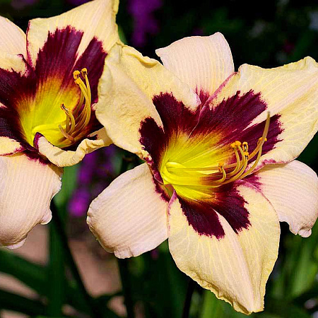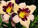 Очень выразительный, контрастный сорт. Цветки крупные, гофрированные, сливочно-кремовые, с ярким глазком цвета спелой вишни и тонкой каймой