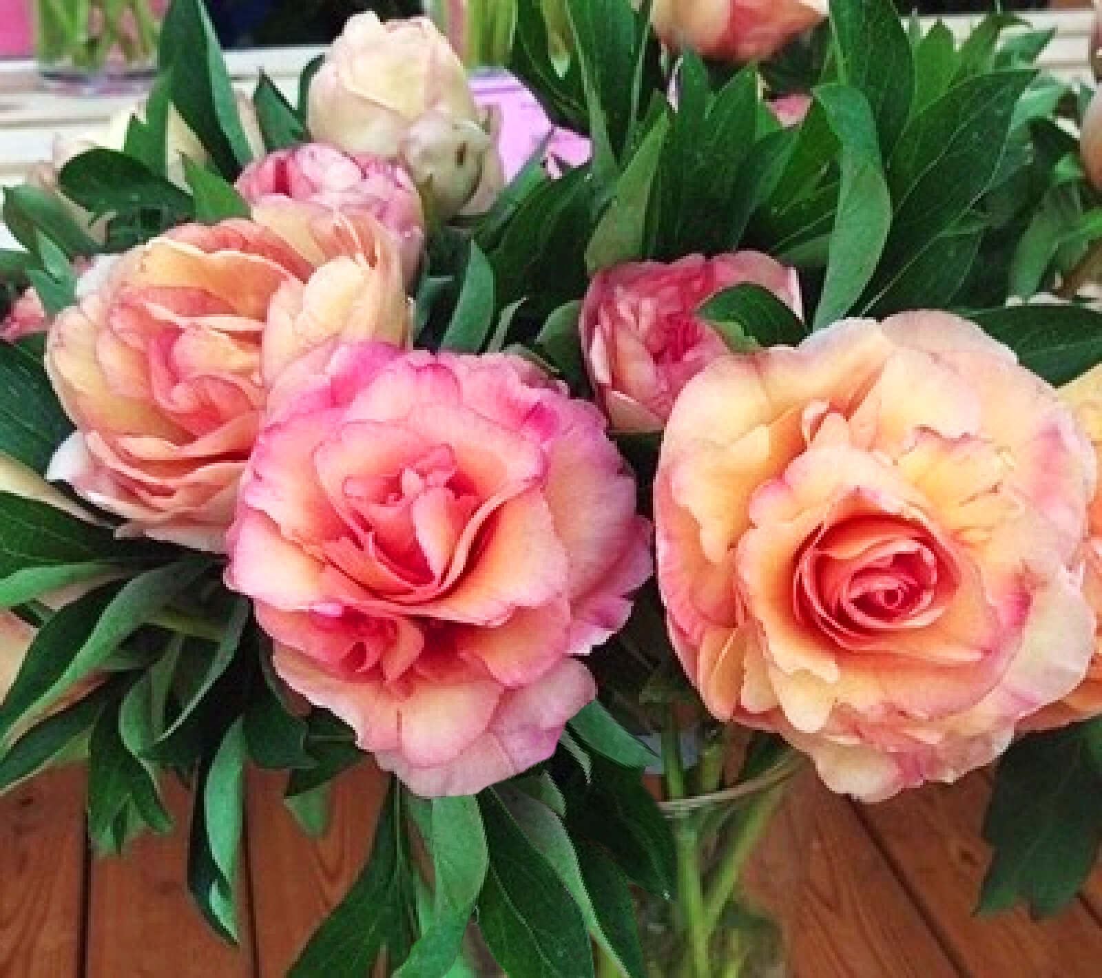 Умопомрачительные пышные махровые цветки сначала нежно-розовые, потом начинают желтеть, приобретая медовый оттенок. В центре красные и малиновые лепестки. Все это напоминает цветение огромных роз. Аромат приятный. Кусты компактные, в диаметре 70-100 см. Побеги прочные, в дополнительных опорах не нуждаются. Зимостойкость до -30°С.