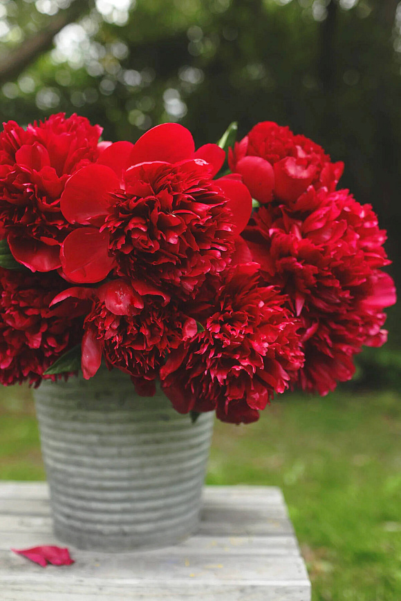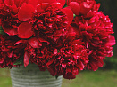 Эталон насыщено-красного цвета в многообразии пионов. Привлекает внимание огромными пышными цветками до 22 см в диметре. Лепестки гофрированные двойные, формируют пышную сердцевину, окруженную рядом крупных чашевидных лепестков. Один из самых ранних сортов с махровыми цветками. Устойчив к солнцу и жаре. Глянцевая темно-зеленая рассечённая листва остается привлекательной в течение всего сезона.