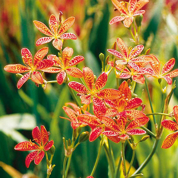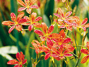 Яркая и броская! Цветки огненные, желто-оранжевые с пурпурным крапом. Из-за пятнистого окраса растение еще называют леопардовой лилией. На каждом разветвленном цветоносе поочередно раскрывается от 12 до 20 бутонов. Поскольку бутонов много, процесс цветения продолжается достаточно долго. Листья высокие, собранные в розетку по 5–8 штук, мечевидные, вырастают до 50 см в длину. На зиму лучше выкапывать.