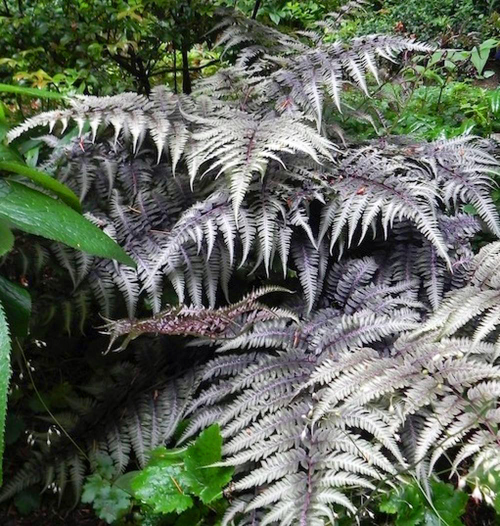 Папоротник-сенсация! Образует объемные розетки из ажурных листьев серебристо-серо-зеленого цвета с металлическим отливом. Бордовые жилки ярко контрастируют с общим фоном.