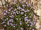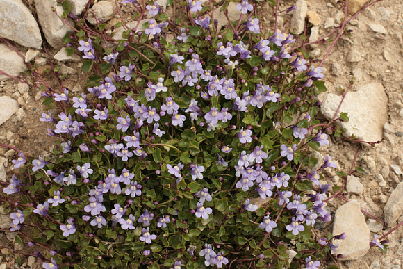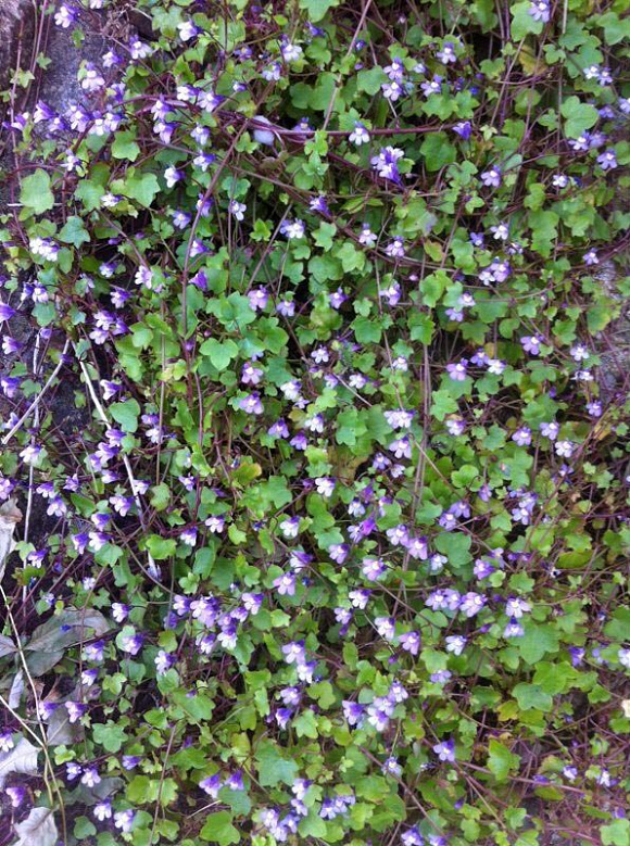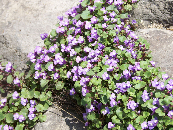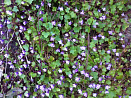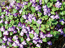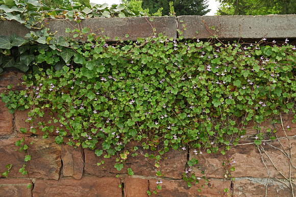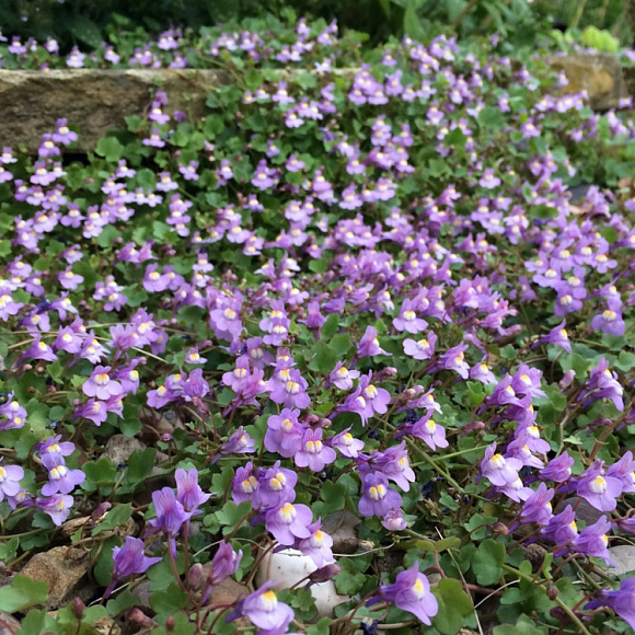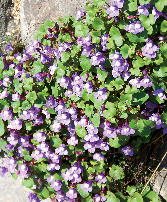 Совершенно неприхотливое ползучее низкорослое растение, стелющееся плотным ковром. Соцветия необычной формы, красивых сине-лиловых цветков. Разрастается цимбалярия очень интенсивно, ее корневища способны проникать в самые узенькие щели – можно сажать между камнями мощения, она может взбираться по оградам и даже по невысоким кустарникам, отлично заполняет пространства между растениями. Цветение непрерывное с конца весны до наступления заморозков. Грунт должен быть умеренным, чтобы вода не застаивалась в зоне корневой системы.
