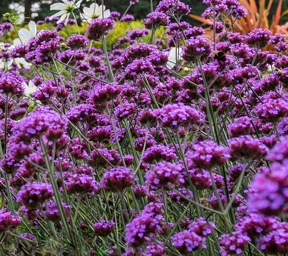 Несмотря на кажущуюся простоту растение очень элегантное и привлекательное. Куст раскидистый, высокорослый, интенсивно ветвящийся. Многочисленные зонтиковидные соцветия формируют крупное ажурное облако нежно-фиолетовых, лиловых оттенков. Наиболее выигрышно смотрятся массовые композиции. Длительность и обильность цветения делают вербену отличным вариантом для фоновых или бордюрных посадок. Обладает удивительной выносливостью и холодостойкостью. Любит рыхлую, дренированную почву без застоя воды.