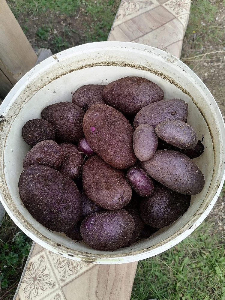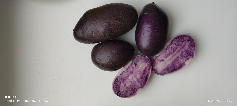 Здравствуйте! Интересный картофель, весь фиолетовый, непривычно. Купил и посадил 24.05.2025 г. из любопытства. Получил из десяти семенных клубней десятилитровое ведро. Клубни не мелкие и небольшие, очень удобно чистить и готовить. На вкус пока не пробовали но, уже поставили отварить пару клубней. Полную картину можно написать только на следующий год после уборки уже полноценного урожая. А пока на хранение для посадки.