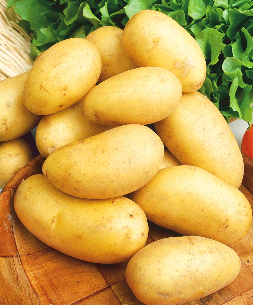 Картофель Колетте очень ранний. Первая копка возможна уже на 45 день, а вторая — на 55. За это время куст разрастается до средних размеров и дает от 6 до 11 картофелин общей массой 3,5-4 кг. Клубни выровненные, форма удлиненно-овальная. Кожура желтая, глазки почти незаметны, на ощупь очень приятная гладкая.