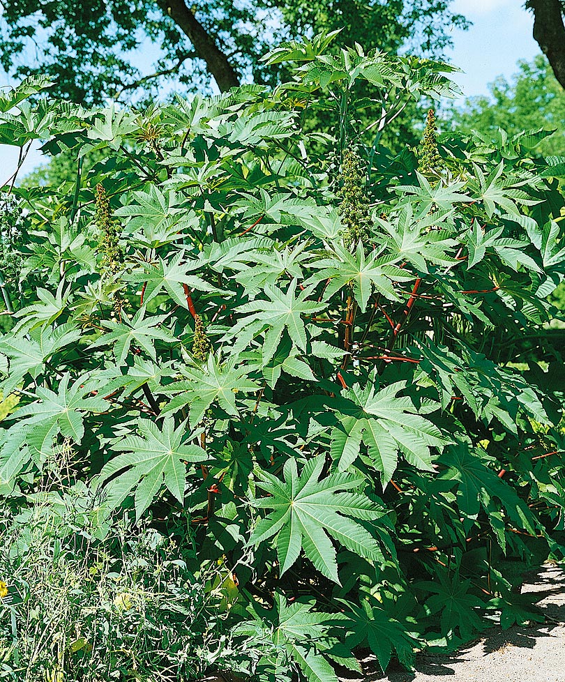 ВЫСАДКА КЛЕЩЕВИНЫ НА ПОСТОЯННОЕ МЕСТО. Клещевина не переносит даже малейших заморозков и высаживают ее на постоянное место, как только минует их угроза, расстояние между растениями 1м.- 1,5 метра. Под клещевину выбирают солнечные участки с легкой и питательной почвой и желательно, что бы к посадке было предусмотрено ограждение от детей. Под каждое растение вкапывают посадочную яму 40 х40 и глубиной 50 см. На дно посадочных ямы помещают слой дренажа 10 см, песок вполне подойдет или битый кирпич. Заполняют почвосмесью еще 10 см и высаживают клещевину, хорошо поливают и мульчируют. Дальнейший уход заключается в поливах, прополках, рыхлении и подкормках. Клещевина ест все, но от органики способна вырасти в настоящую уже, а не в декоративную пальму. Поэтому используйте в ее питании фосфорно–калийными или сбалансированными питательные комплексы, не чаще одного раза в 15 – 20 дней, для сохранения блеска листьев и яркости красок, ей вполне достаточно этого питания.