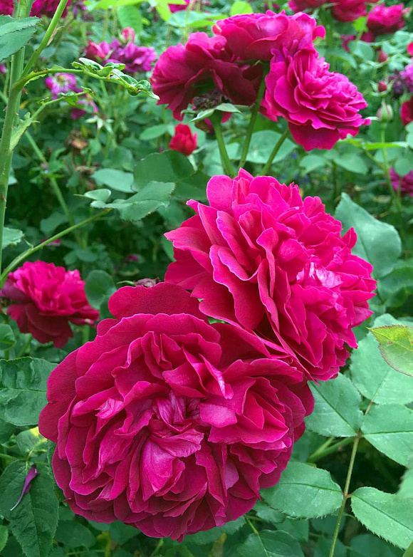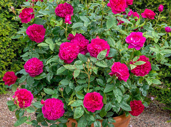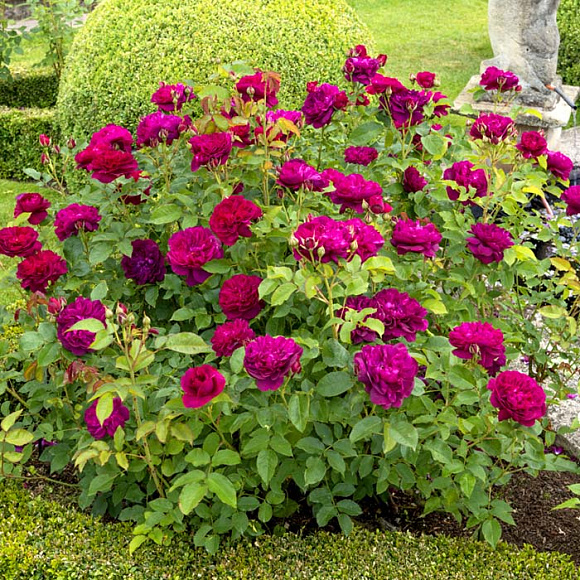 Утонченная грациозность и совершенство формы в каждом цветке! Не случайно одна из самых известных балерин Англии подарила этому сорту розы свое имя. Цветки густомахровые, ярко-малиновые, с переливами лилово-фиолетовых оттенков на разных этапах цветения. Собраны в кисти по 3–5 штук. Лепестки бархатные, слегка загнуты вовнутрь, в центре формируют отдельные сегменты. Диаметр распустившихся бутонов – 10–12 см. Аромат легкий, фруктовый. Цветение обильное и непрерывное. Куст аккуратный, компактный, не разваливается и не теряет форму. Устойчивость к заболеваниям очень высокая. Зимостойкость −25 °С.