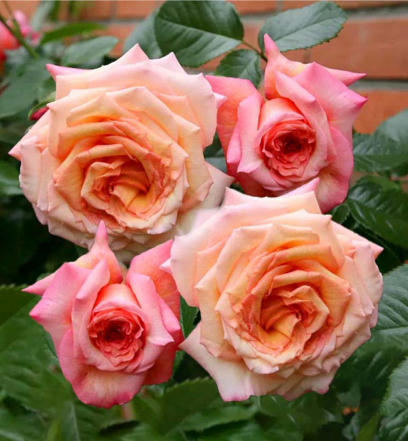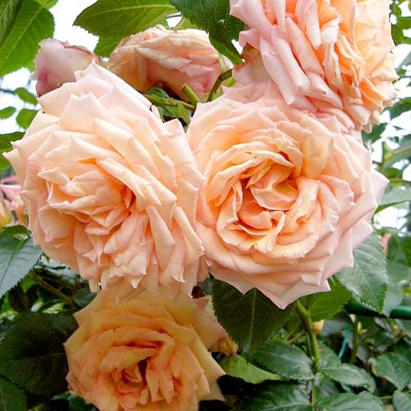 Этот сорт розы как будто пришел к нам из прошлых веков, олицетворяя роскошь и красоту всем известного стиля “барокко”. Грациозный и легкий наклон распустившихся бутонов позволяет рассмотреть их природную изысканность. Каждый лепесток при полном раскрытии виртуозно закручивается наружу, зачастую принимая форму конвертика, что придает розам неповторимый классический образ. Удивительные цветовые оттенки буквально переливаются, плавно переходя от желтого к абрикосовому, от лососевого к розовато-белому. Диаметр густомахровых цветков 9-11 см, они собраны в великолепные кисти по 5-10 штук. Цветение эффектное и завораживающее, при этом практически непрерывное. Аромат теплый, сладковато-пряный. Куст сильнорослый, с прочными побегами и темно-зеленой блестящей листвой. Зимостойкость до -30°С.