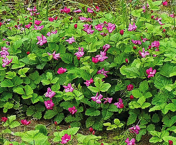 Невысокий кустарник с резными тройчатыми листьями. Плоды массой 1 г – сочные многокостянки, по вкусу напоминают клубнику, малину и ежевику, только еще более насыщенные и ароматные. Цвет ягод малиново-красный, как будто светящийся изнутри. Плодоношение растянутое. Рекомендуем сажать не менее 2 кустов, так как требуется перекрестное опыление.